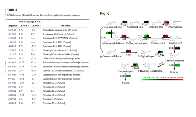a)LE品種內(nèi)果皮破裂與發(fā)育不全是一個非常復雜的表型,與眾多的代謝通路相關,但類苯基丙烷相關通路是眾多代謝通路中已經(jīng)證實的非常重要的一個。該項目中對兩個品種在兩個時間點的差異表達基因的KEGG富集分析結(jié)果也證實了上述事實,所以差異基因顯著富集于類苯基丙烷代謝、合成等通路。類苯基丙烷相關通路相關差異表達基因見列表4與圖6。