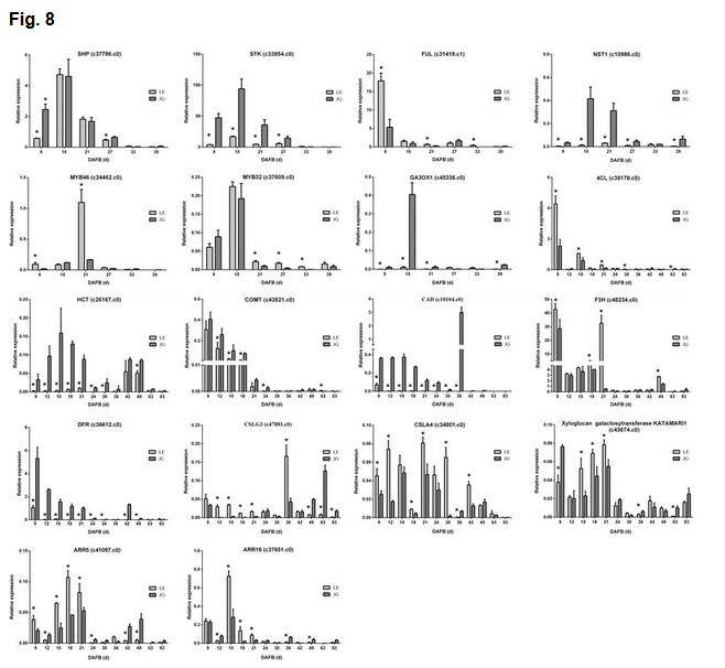 b)一些轉(zhuǎn)錄因子也被報道與內(nèi)果皮發(fā)育相關,包括SHP 、 STK、ALC、IND、FUL、RPL、NST1、NST3以及一些MYB家族轉(zhuǎn)錄因子。該項目中,SHP, FUL, MYB32 ,STK, MYB46–1, MYB46–2, ?NST1 也包含在兩個品種間的差異表達基因列表中,也發(fā)現(xiàn)了上述部分基因差異表達方向與預期不符。