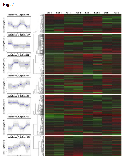 a)文章最后,使用K-means聚類對之前得到的差異表達基因進行了共表達分析,分析結(jié)果顯示:基于表達趨勢,所有差異基因可劃分為7個cluster,每個cluster內(nèi)部的基因具有相似的表達趨勢,也就可能在細胞內(nèi)行駛著相似的功能,聚類結(jié)果見圖7。 b)之前分析得到的內(nèi)果皮發(fā)育相關基因大多分布在cluster1或者cluster6,cluster1中的基因在LE品種中高表達,JG品種低表達,cluster6與cluster1相反。