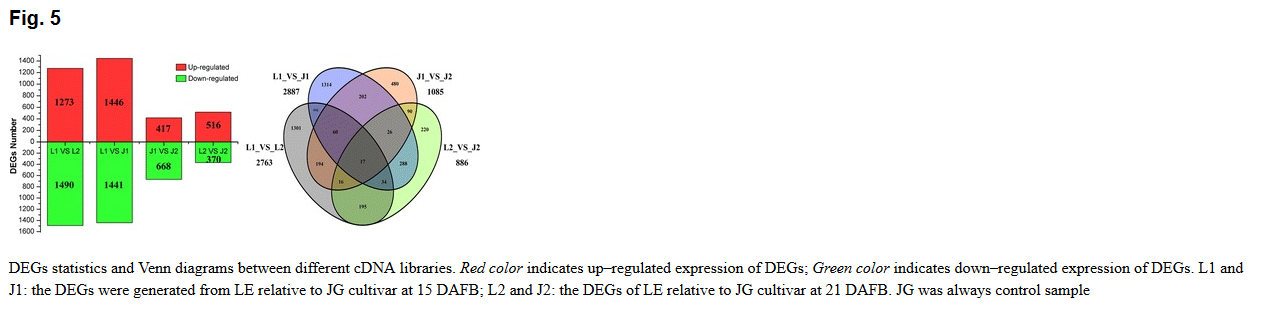 使用DESeq進行了差異表達基因檢測,差異表達基因篩選閾值為:FDR<0.01,F(xiàn)C > 2 。15DAFB時間點上,兩個品種間檢測到差異表達基因2887個,24DAFB時間點上,兩個品種間檢測到差異表達基因886個,具體上下調(diào)、共有特有情況請參見圖5.