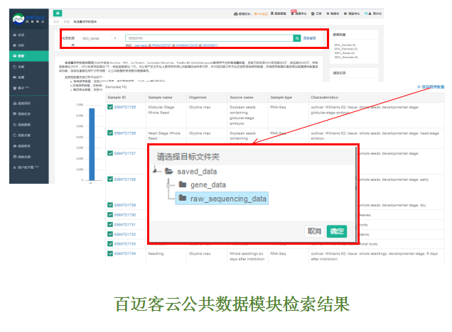 1)下載大豆RNA-seq公共數(shù)據(jù)集: 數(shù)據(jù)集1 SRA數(shù)據(jù)庫編號(hào):PRJNA140081. 包含14個(gè)樣本,其中11個(gè)樣本為生殖組織來 源(花、豆莢、種子),3個(gè)為營養(yǎng)組織來源(葉、根、根瘤) 數(shù)據(jù)集2 GEO數(shù)據(jù)庫編號(hào): GSE29163. 包含10個(gè)樣本,其中6個(gè)樣本為生殖組織來源(花、花芽、種子),4個(gè)樣本為營養(yǎng)組織來源(根、莖、葉、幼苗) 該步驟可進(jìn)入BMKCloud_數(shù)據(jù)庫模塊按數(shù)據(jù)編號(hào)完成數(shù)據(jù)檢索及一鍵保存,保存后的數(shù)據(jù)可直接調(diào)用百邁云平臺(tái)的分析模塊BMKCloud_APP進(jìn)行后續(xù)分析。