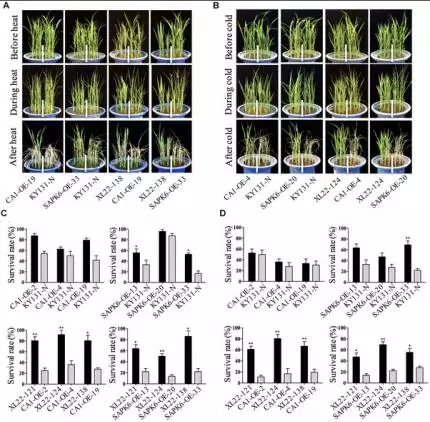 分別取XL22、CA1-OE、SAPK6-OE、KY-131-N的4葉齡種子材料,每個(gè)3個(gè)生物學(xué)重復(fù),均進(jìn)行42℃ 12小時(shí),4℃5天處理,最后正常環(huán)境下生長(zhǎng)7天,觀察這各材料之間的葉卷曲清苦以及存活率,結(jié)果顯示,XL22表現(xiàn)為個(gè)更高的存活率(圖5C),更加輕微的葉片卷曲(圖4A),表明XL22相較于單基因轉(zhuǎn)化株與非轉(zhuǎn)基因株擁有更強(qiáng)的耐熱、抗寒能力。