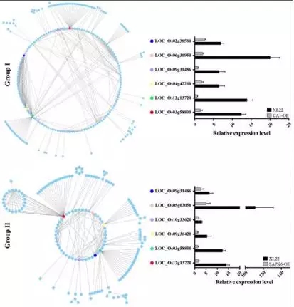d)為了揭示GroupI 、Group2兩個(gè)基因集內(nèi)部的基因調(diào)控關(guān)系,研究者基于STRING數(shù)據(jù)庫(kù)分別繪制了上述兩個(gè)基因集內(nèi)部基因的蛋白互作網(wǎng)絡(luò)圖。如圖7所示,GroupI蛋白互作網(wǎng)絡(luò)中包含481個(gè)PPI(protein-protein intereaction,PPI),Group2中包含280個(gè)PPI。其中,有6個(gè)基因在蛋白互作網(wǎng)絡(luò)中均處于非常中心的位置(與之互作蛋白數(shù)量越多,越靠近中心位置)。其中,3個(gè)(LOC_Os12g13720, ?LOC_Os03g58800, ?LOC_Os09g31486) 在兩個(gè)蛋白互作網(wǎng)絡(luò)中均處于中心位置,分別編碼 PDR ABC transporter, a ATPase, and a DnaK/Hsp70s family protein,可能在干旱應(yīng)答過(guò)調(diào)控網(wǎng)絡(luò)發(fā)揮著非常關(guān)鍵的;其他3個(gè)基因(Group1特異:LOC_Os04g42260 ?LOC_Os02g38580,Group2特異:LOC_Os05g03050)分別編碼protein phosphatase、Rad51、Hsp90 ,從功能可以看出,它們與水稻干旱應(yīng)答同樣相關(guān)。