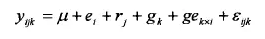 利用方差分析計(jì)算各性狀的環(huán)境方差、重復(fù)方差(有試驗(yàn)重復(fù))、遺傳方法、基因型與環(huán)境互作方差、誤差方差和遺傳力,并估計(jì)哥哥變量的遺傳效應(yīng)。方差分析的線性模型為: